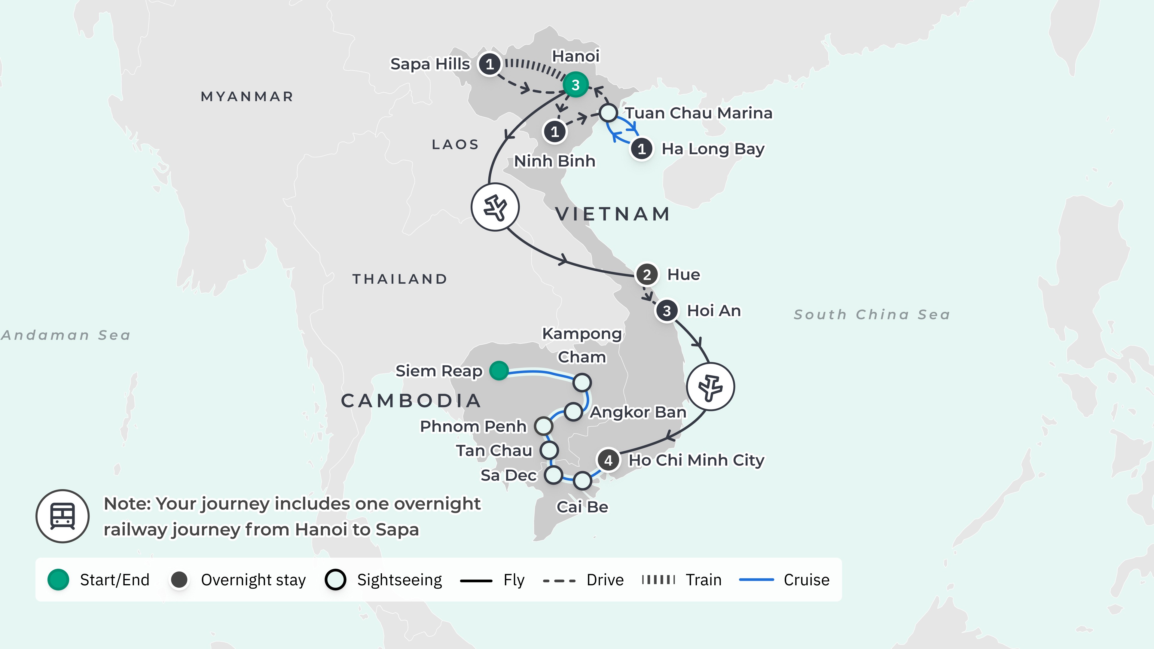 Your tour begins at Noi Bai International Airport (HAN) and ends at the port in Siem Reap, with arrival transfers only.