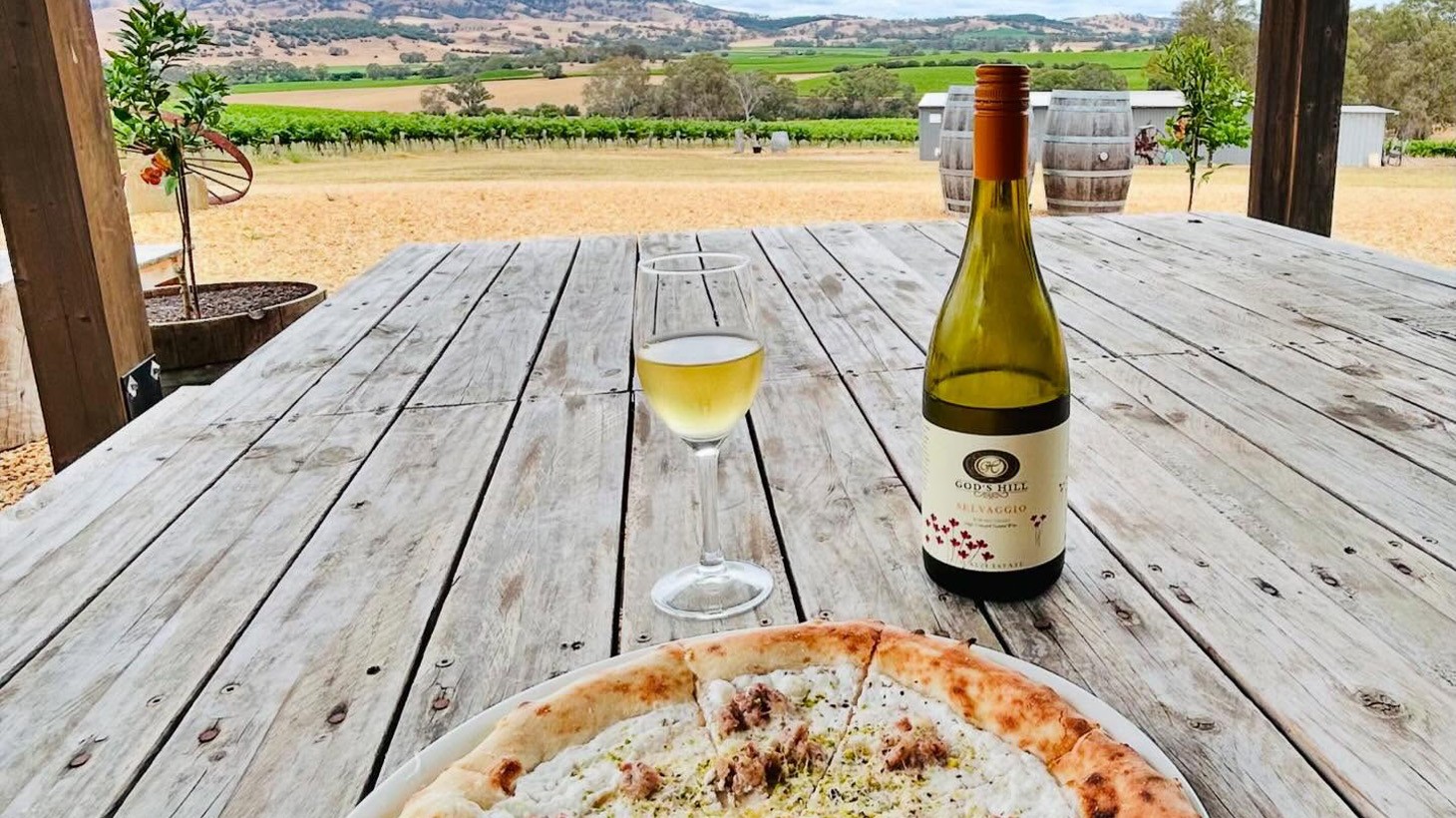 • Gluten-free pizza bases are available for a surcharge of A$4 per pizza, payable directly to God’s Hill Wines