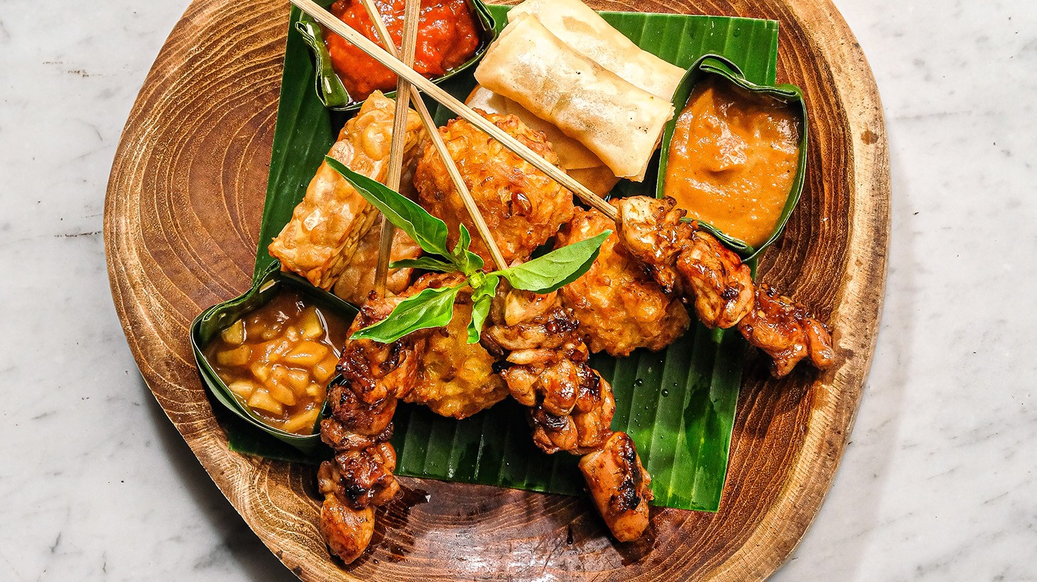 • Entree (shared between two): Balinese Tapas: Corn fritters, tempe, spring rolls & chicken satay