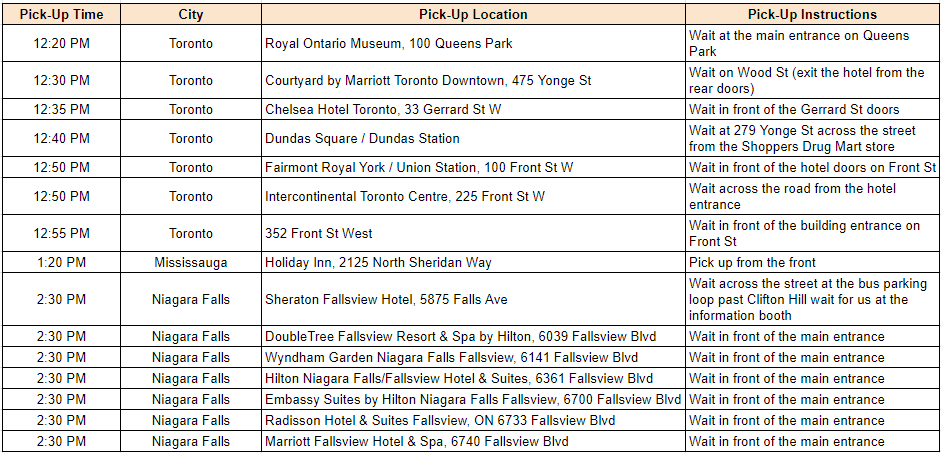 • Pick-up is available from selected locations in Toronto, Mississauga and Niagara Falls hotels. Click here to view the pick-up locations