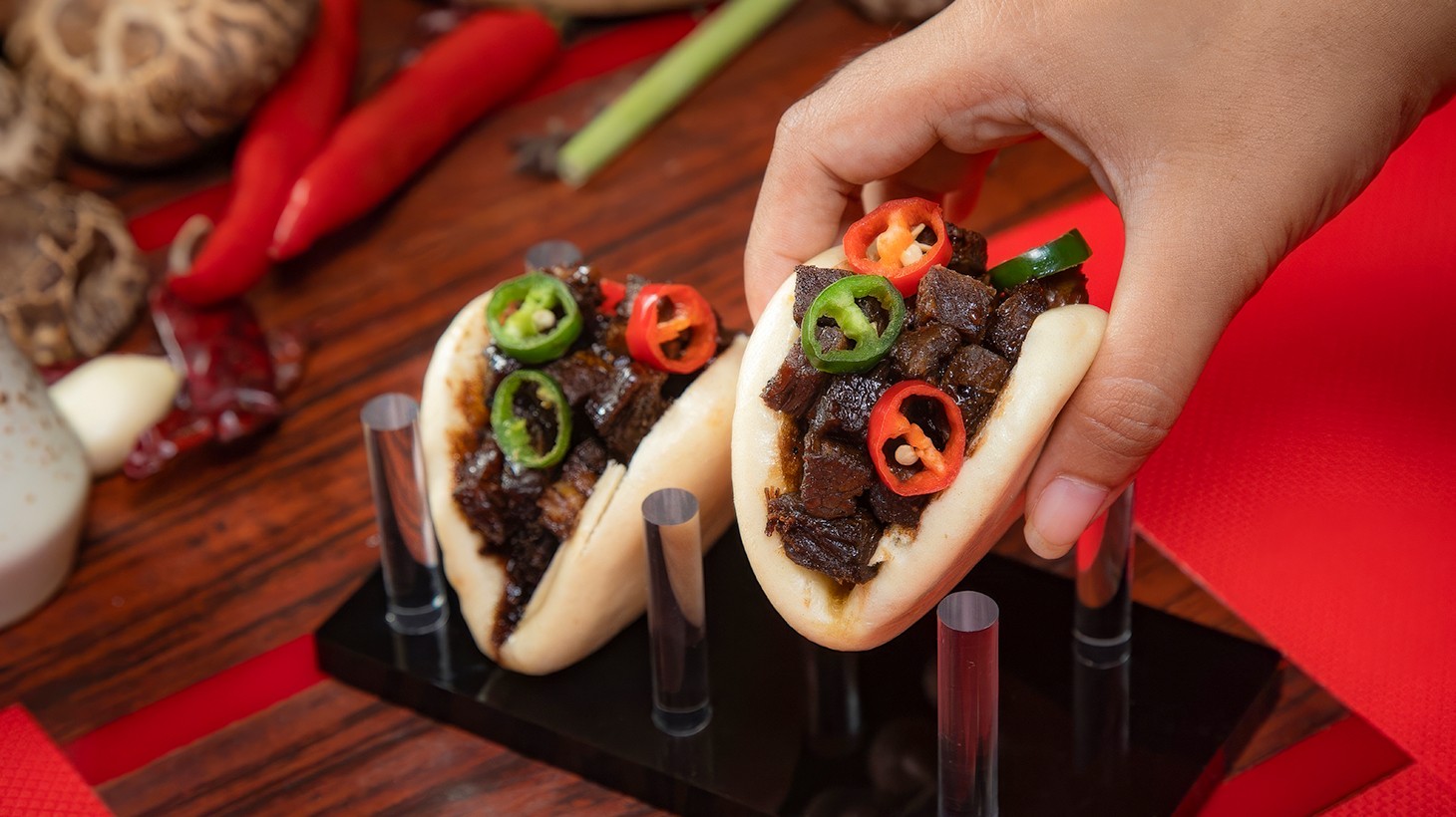 • Black Pepper Beef Bao with red & green chili