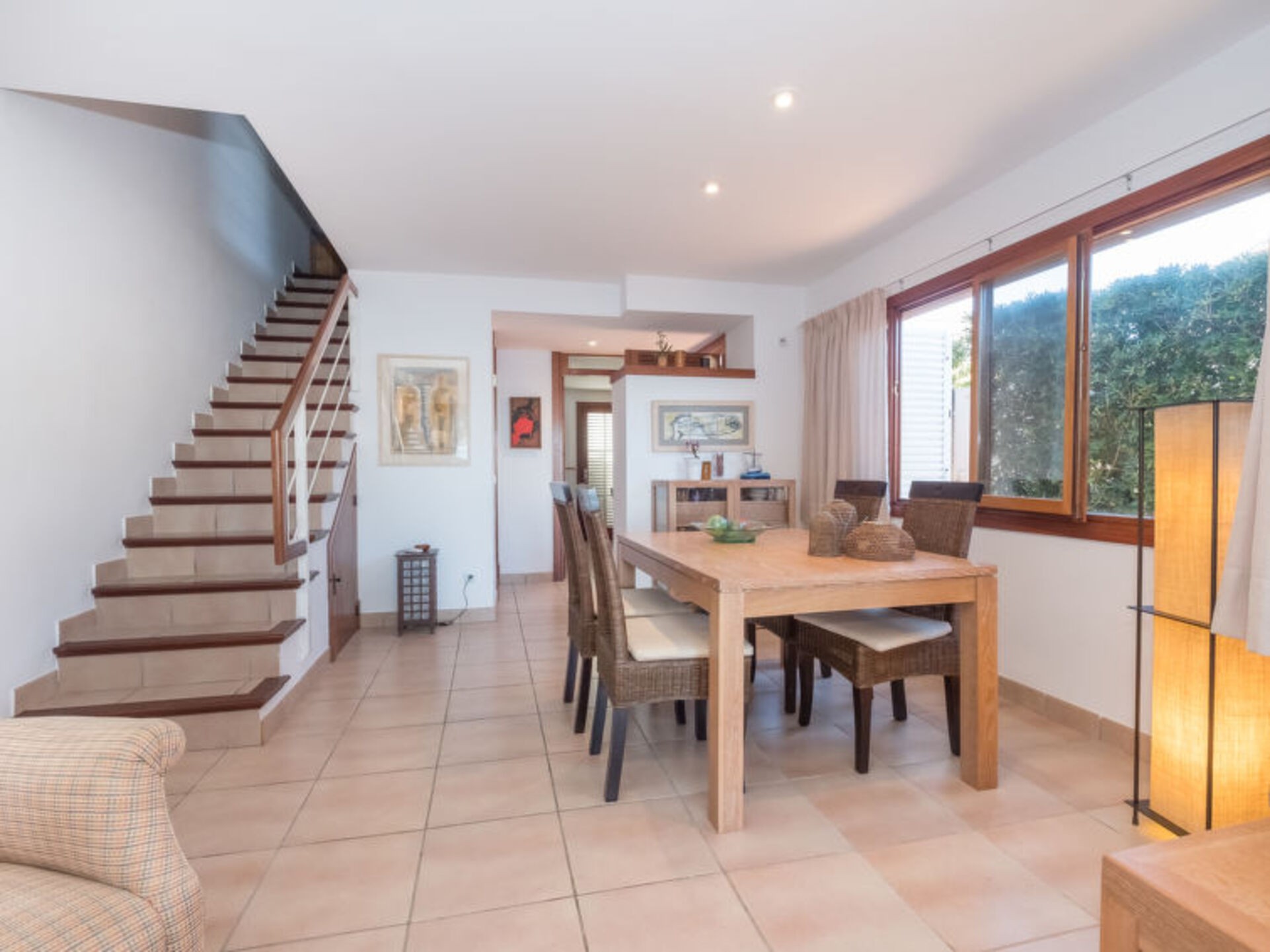 “Mallorca Villa 1284”, 5-room semi-detached house 125 m2 on 2 levels. Object suitable for 8 adults. Spacious and bright, very comfortable and tasteful furnishings: large living/dining room with sliding door, panoramic window with dining table, satellite TV, air conditioning and forced-air heating. Exit to the patio. Kitchen (oven, dishwasher, 3 ceramic glass hob hotplates, toaster, kettle, microwave, freezer, electric coffee machine) with dining table. Bath/WC. Upper floor: 1 large double bedroom with sliding door, panoramic window with 1 french bed, bath/shower/WC, air conditioning and forced-air heating. Exit to the balcony. 1 double bedroom with panoramic window with 1 x 2 bunk beds (90 cm), air conditioning and forced-air heating. 2 rooms with panoramic window, each room with 1 pull-out bed (2 pers. 2 x 90 cm), air conditioning and forced-air heating. Bath/WC with corner bath. Patio, lawn. Terrace furniture, barbecue, deck chairs, covered balcony. Marvellous view of the sea and the mountains. Facilities: washing machine, iron, children’s high chair, baby cot, hair dryer. Internet (WiFi, free). Reserved parking (fenced), garage. Suitable for families. Mallorca Villa 1284