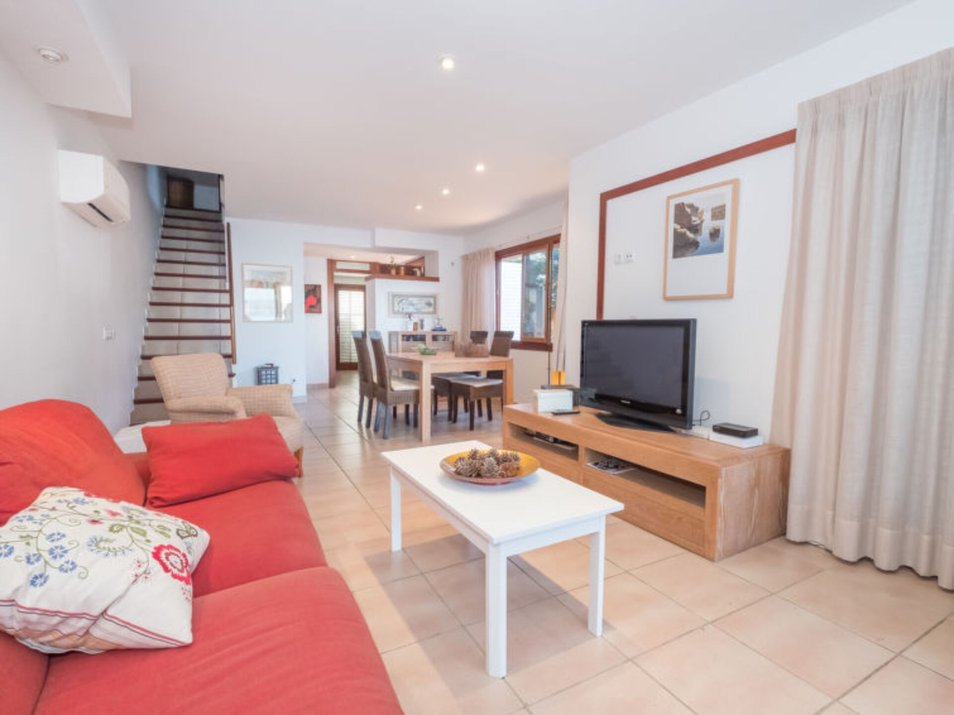 Barcarés 1 km from Alcudia: Very beautiful, cosy semi-detached house “Mallorca Villa 1284”, 2 storeys, semi-detached. In the district of Es Barcarés, in a sunny position residential area (villas), 2 km from the edge of the forest, 5 m from the sea, 100 m from the beach, direct access to the beach. Private: garden (not fenced) with lawn. Outdoor shower, patio, pergola, garden furniture, barbecue. In the house: WiFi, storage room for bicycles, air conditioning, washing machine. Parking at the house on the premises. Shop 1.5 km, grocery 1.5 km, supermarket 300 m, restaurant, bar 50 m, bakery 1.5 km, bicycle rental 1 km, pub garden 50 m, 15 minute walk to the centre, bus stop 1 km, sandy beach “Es Morer Vermell” 300 m, rocky beach 5 m. Sports harbour 200 m, marina 3 km, golf course (18 hole) 5.3 km, tennis 3 km, riding stable 3.5 km. Please note: suitable for families, suitable for seniors. Object suitable for 8 adults groups of teenagers on request only. Loading and unloading of baggage is possible at the holiday house. Airfield 62 km from the property.