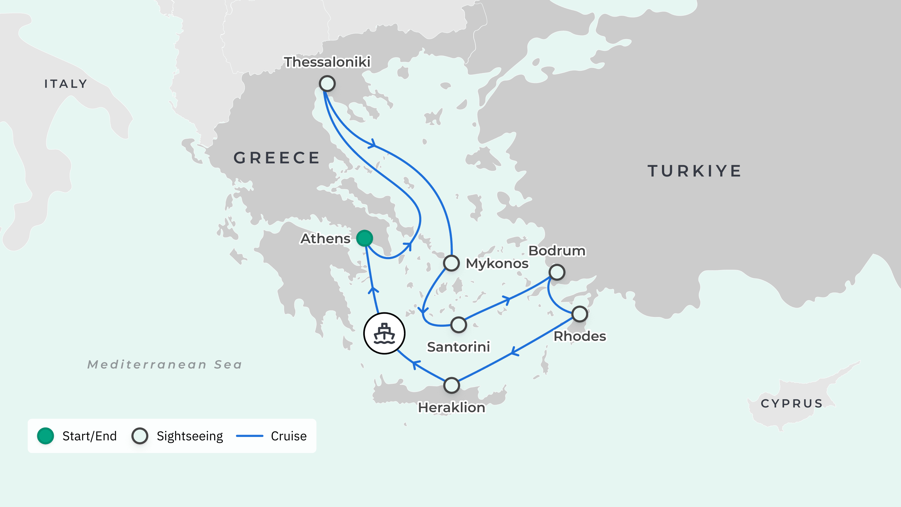 Your cruise begins and ends in Athens (Piraeus), Greece.