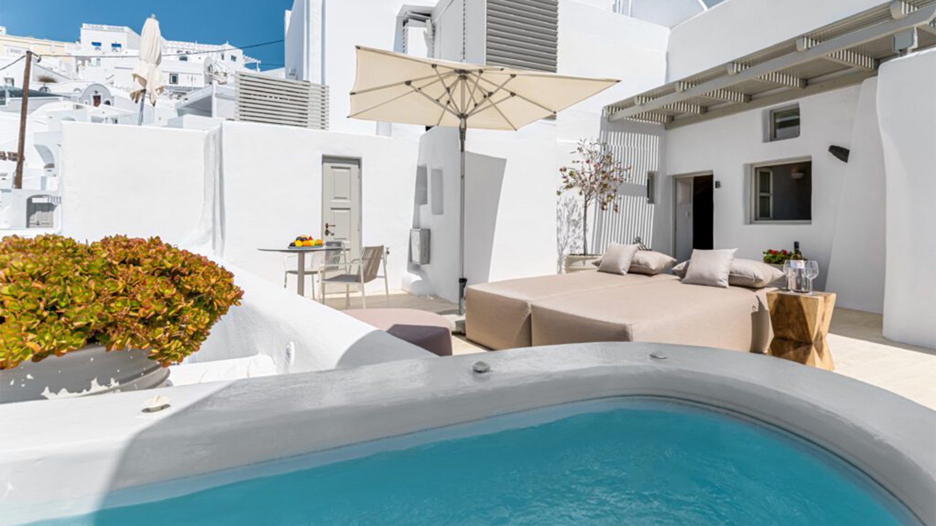 Iconic Santorini offers an outstanding location with the town of Oia, renowned as the ultimate spot to catch stunning sunsets, just a 20-minute drive away. Immerse yourself in the island’s rich history by exploring ancient ruins, visiting traditional villages and savouring local cuisine. The hotel is located approximately a 15-minute drive from Santorini Airport (JTR). Airport transfers are not included in your package, please plan accordingly.