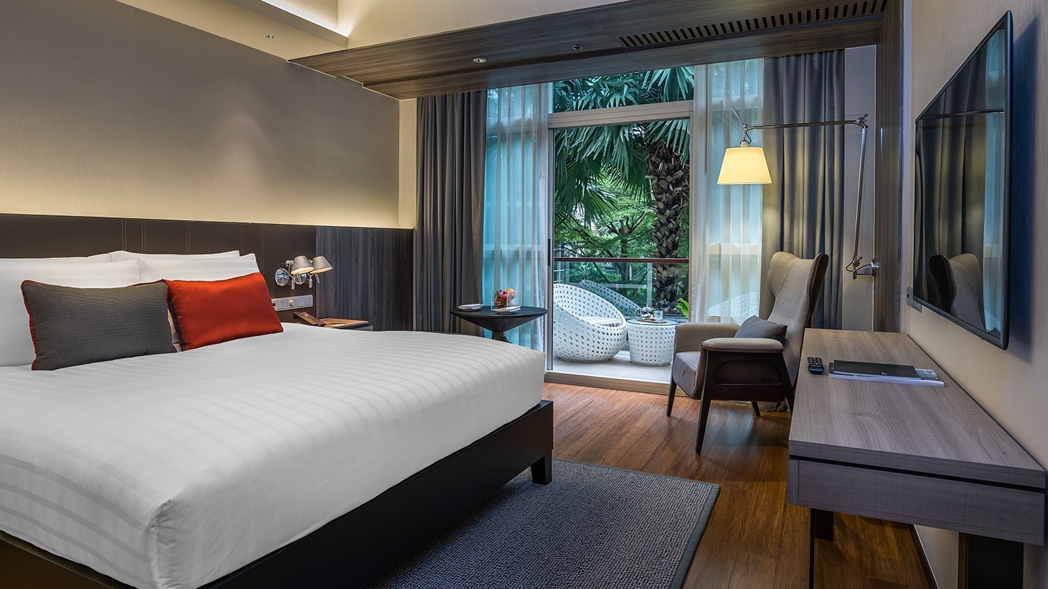 Situated in the heart of the city, Pullman Bangkok King Power has direct access to the King Power Duty Free Complex. It is within a short distance of Victory Monument BTS Station and Phaya Thai Airport Rail Link, providing access to all of the city’s attractions within minutes. The hotel is located approximately a 25-minute drive from Don Mueang International Airport (DMK) and a 50-minute drive from Suvarnabhumi Airport (BKK). One-way arrival transfers are included in select packages only, please see the Fine Print for details.