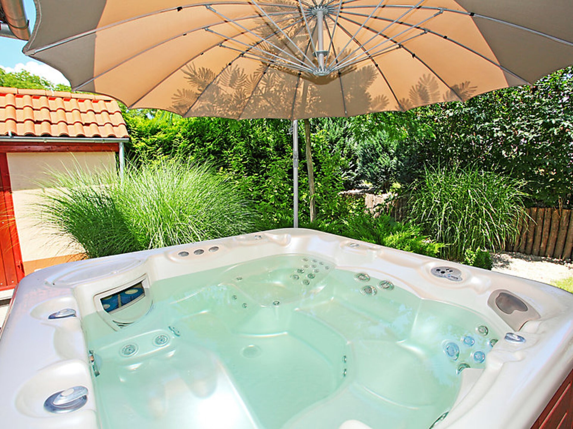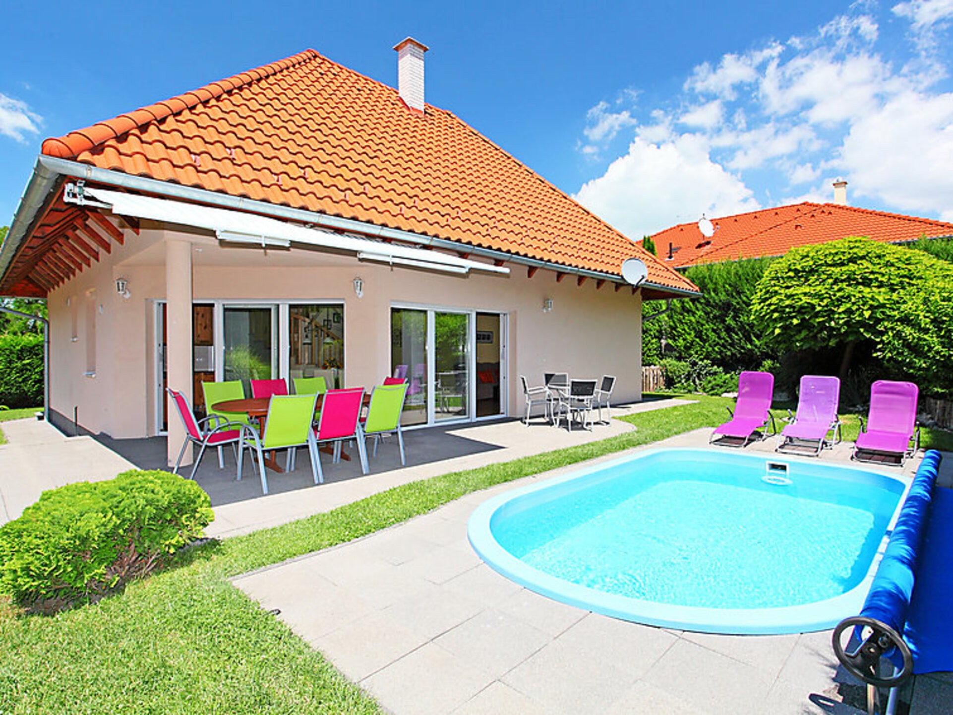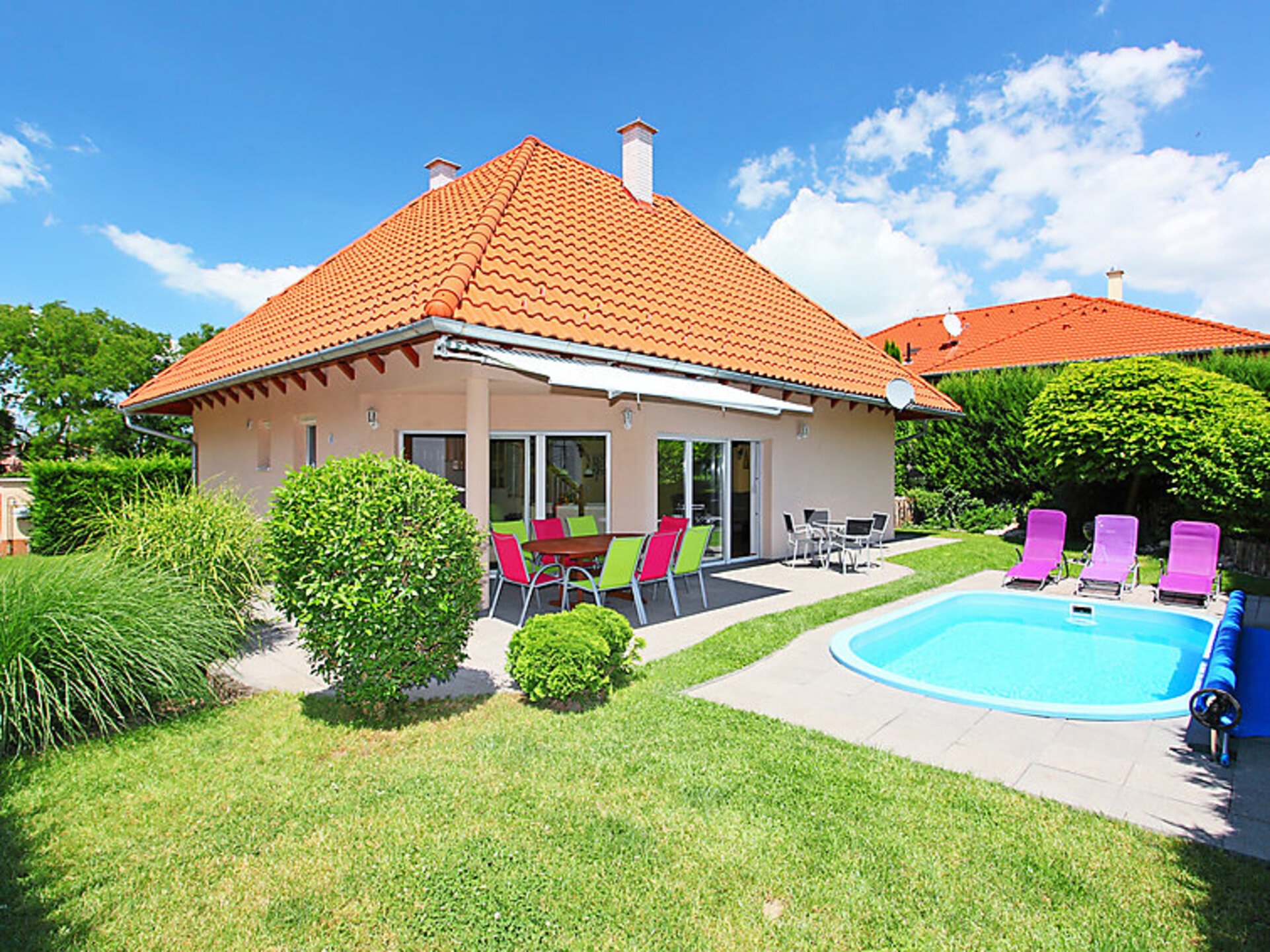 Szabadifurdo 4 km from Siofok: Beautiful, cosy villa “Somogy County Villa 1010”, built in 2007. 4 km from the centre of Siofok, on the outskirts, in a quiet, sunny position, 500 m from the lake. Private: property (fenced), beautiful garden, lawn for sunbathing, swimming pool kidney shaped (3 x 4 m, depth 120 cm, 01.05.-01.10.) with internal staircase. Fireplace. In the house: WiFi, sauna (extra). Hydro massage bath (extra). Central heating system, burglar alarm system. Parking at the house. Shop 1 km, supermarket 3 km, restaurant 1 km, railway station “Siofok-Szabadifurdo” 1 km, grass beach 500 m, thermal baths 1.5 km. Sports harbour 4 km, tennis 1 km. Please note: railway line closeby.