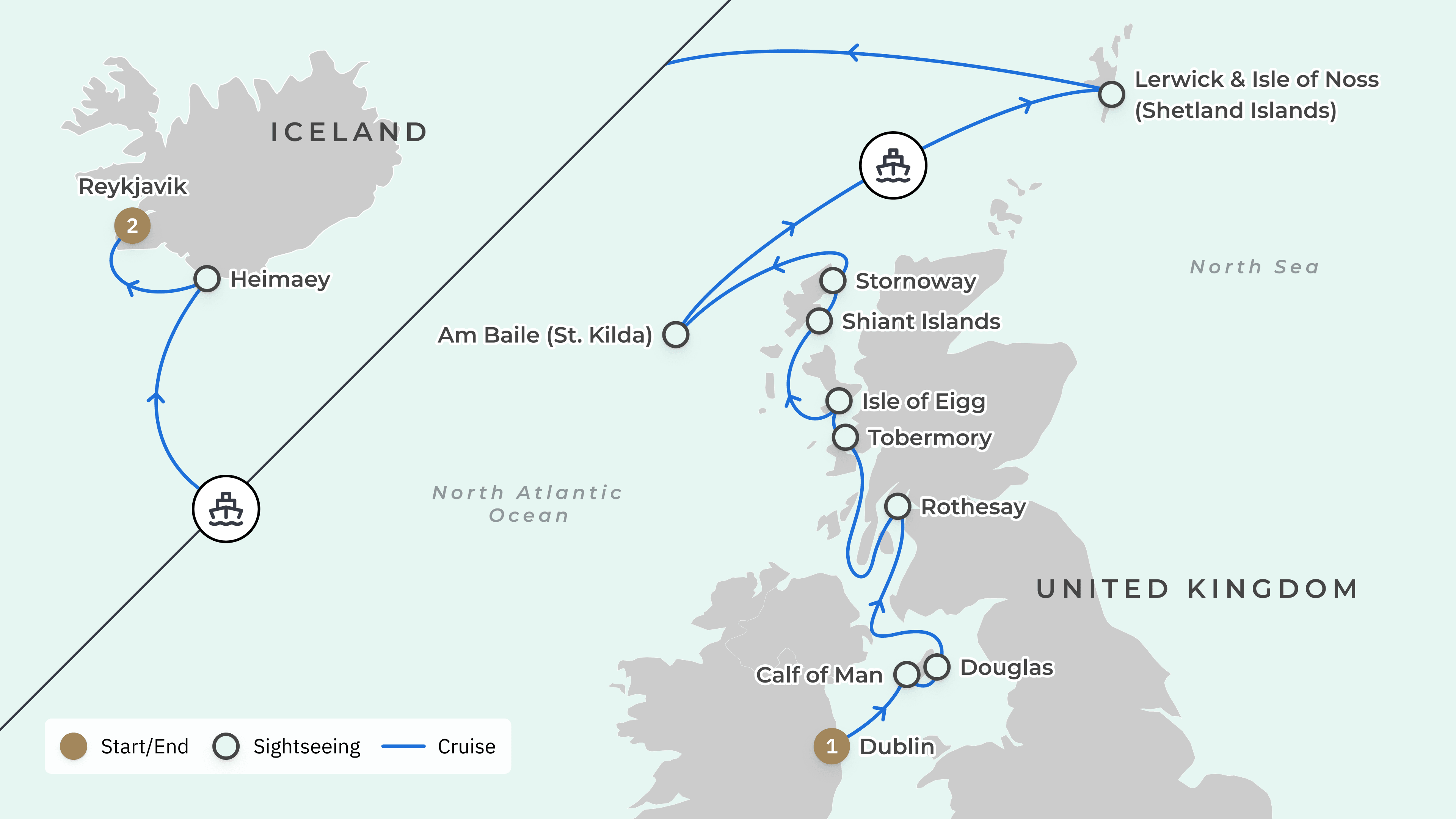 Your cruise takes you from Australia to: Dublin – Calf of Man (Isle of Man) – Douglas (Isle of Man) – Rothesay (Isle of Bute) – Tobermory (Isle of Mull) – Isle of Eigg – Shiant Islands – Stornoway (Isle of Lewis) – Am Baile (St Kilda) – Lerwick (Shetland Islands) – Isle of Noss (Shetland Islands) – Heimaey – Reykjavik.