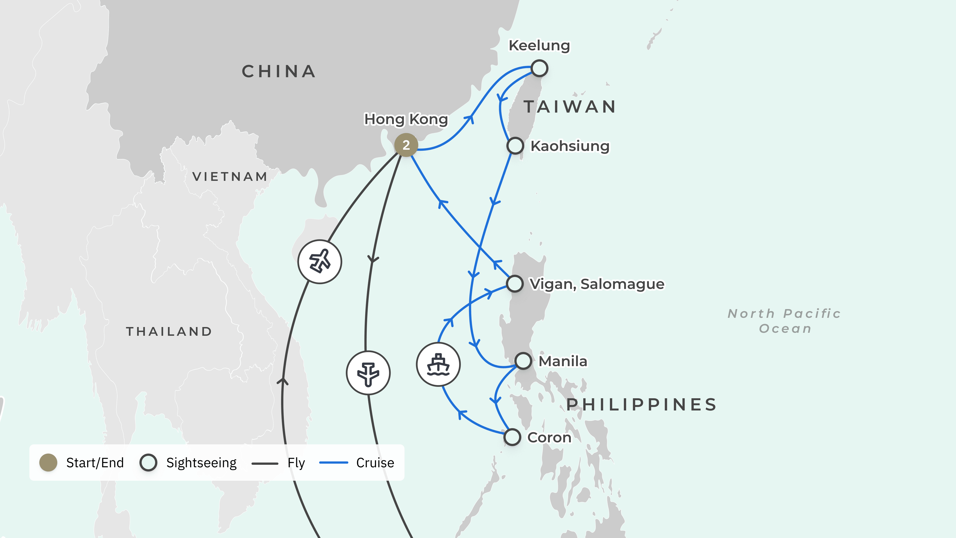 Your journey takes you from Australia to: Hong Kong – Keelung, Taiwan – Kaohsiung – Manila, Philippines – Coron – Vigan – Hong Kong.