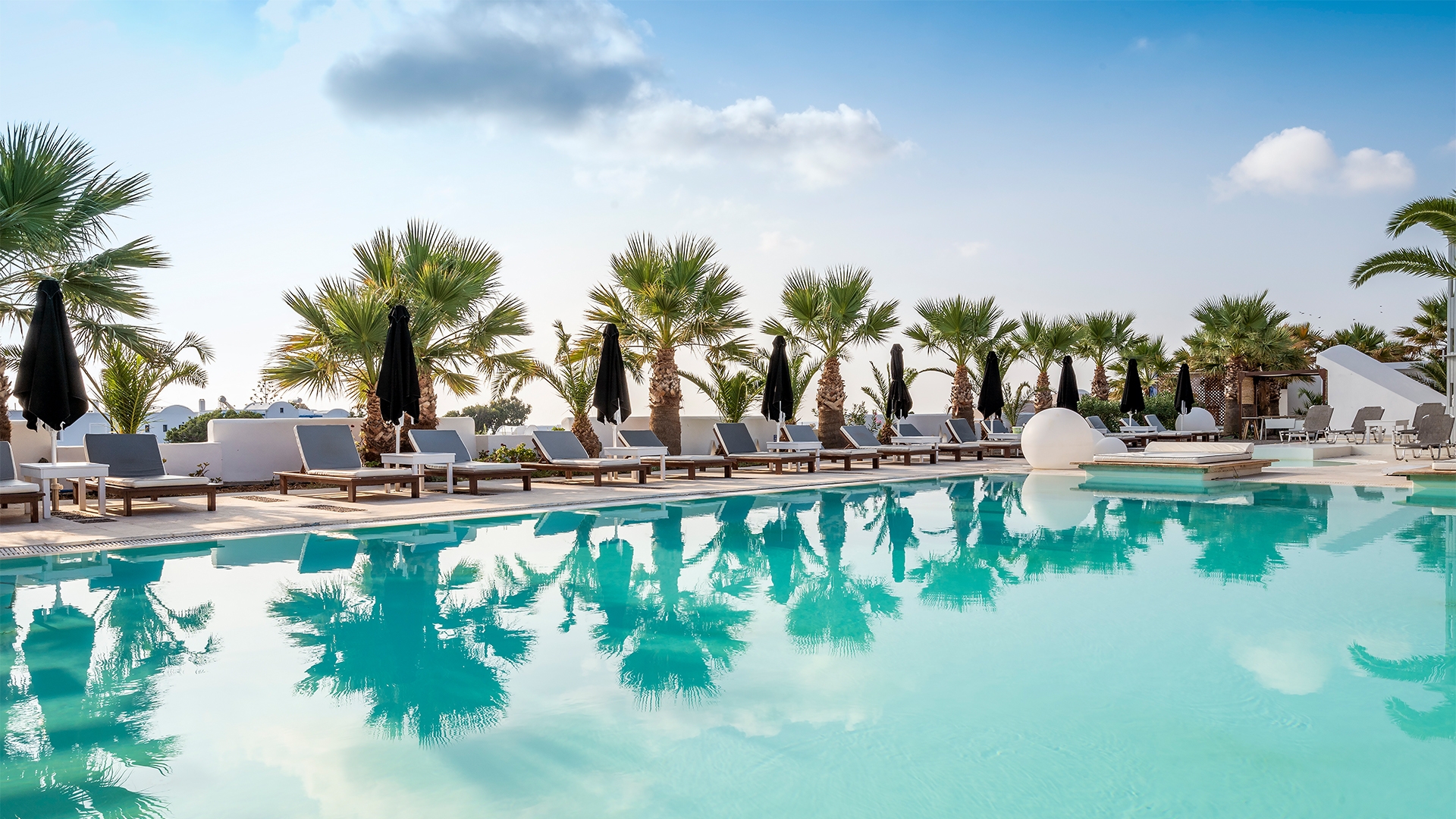 Set on Santorini’s east coast near Kamari Beach, this whitewashed retreat pairs Cycladic lines with Aegean-facing terraces and a calm pool framed by palms. Rooms and suites feature minimalist interiors, private balconies and crisp sea or garden views. The onsite restaurant serves Greek plates with local produce and Santorini wines.