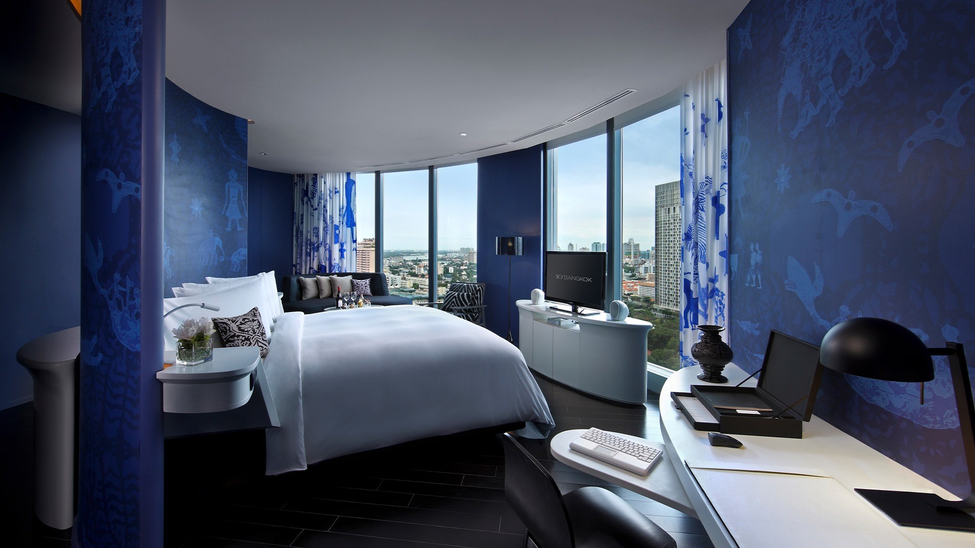 SO/ Bangkok is located opposite Lumpini Park, a lush pocket of greenery in Bangkok’s urban jungle. Local restaurants, cafes and bars are within easy walking distance of the hotel. Exploring is made easy with Lumphini MRT station a five-minute walk away, while Sala Daeng BTS station is a 10-minute walk further. The hotel is located approximately a 40-minute drive from Suvarnabhumi Airport (BKK). One-way arrival airport transfers are included in select packages, please see the Fine Print for details.