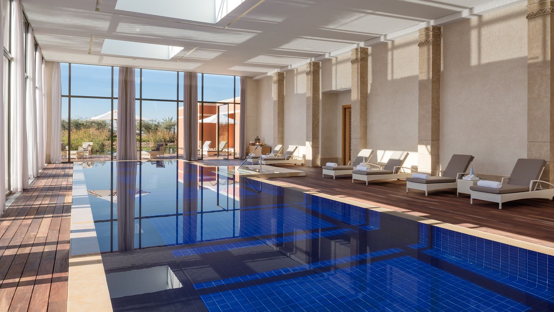 The Oberoi Marrakech is positioned just outside the city proper, amid a massive estate of verdant gardens, citrus orchards and olive groves, with the snow-capped Atlas Mountains as a stunning backdrop. The hotel is located approximately a 35-minute drive from Marrakech Menara Airport (RAK). Return airport transfers are included in your package, please contact the hotel to arrange.