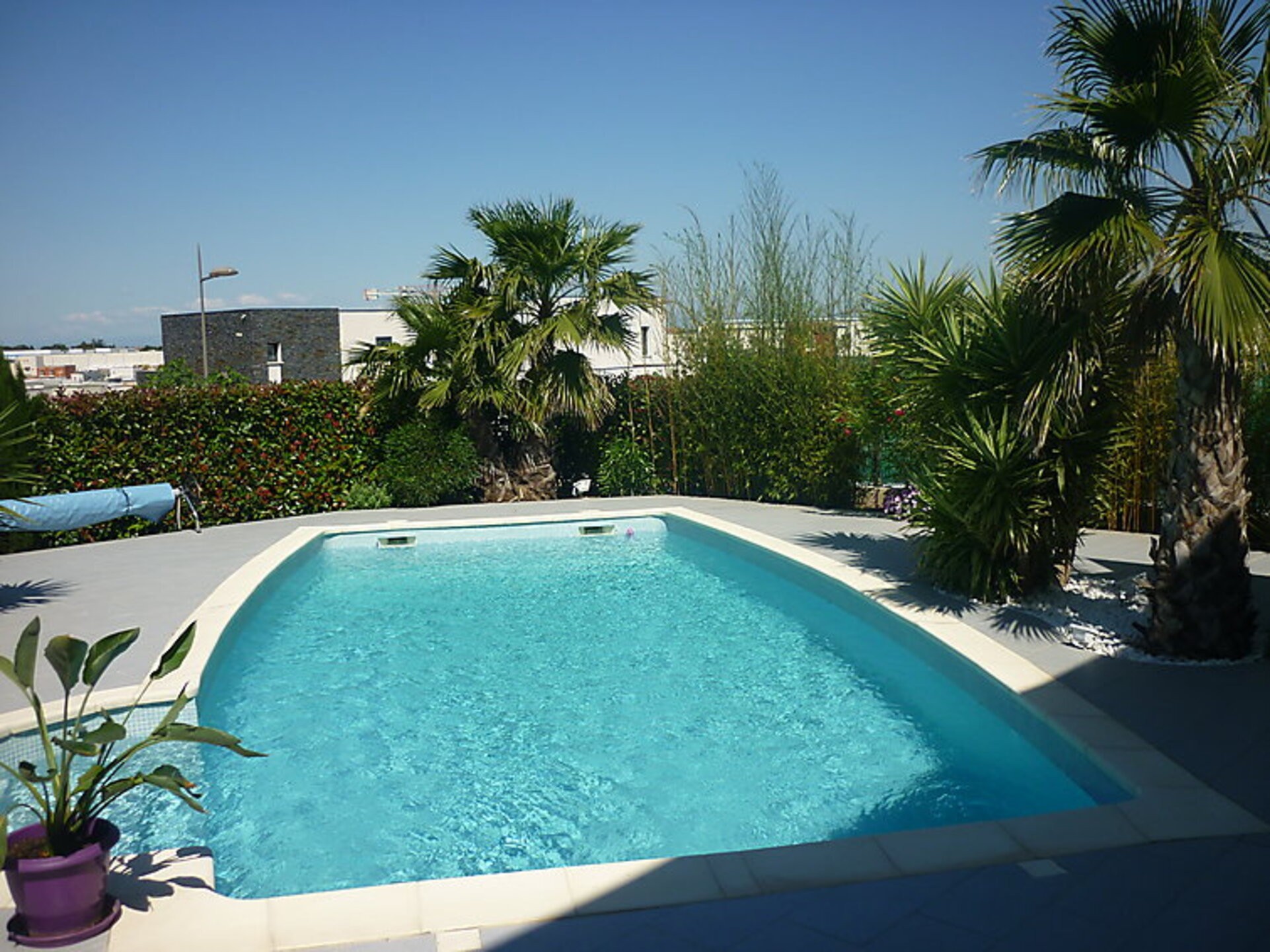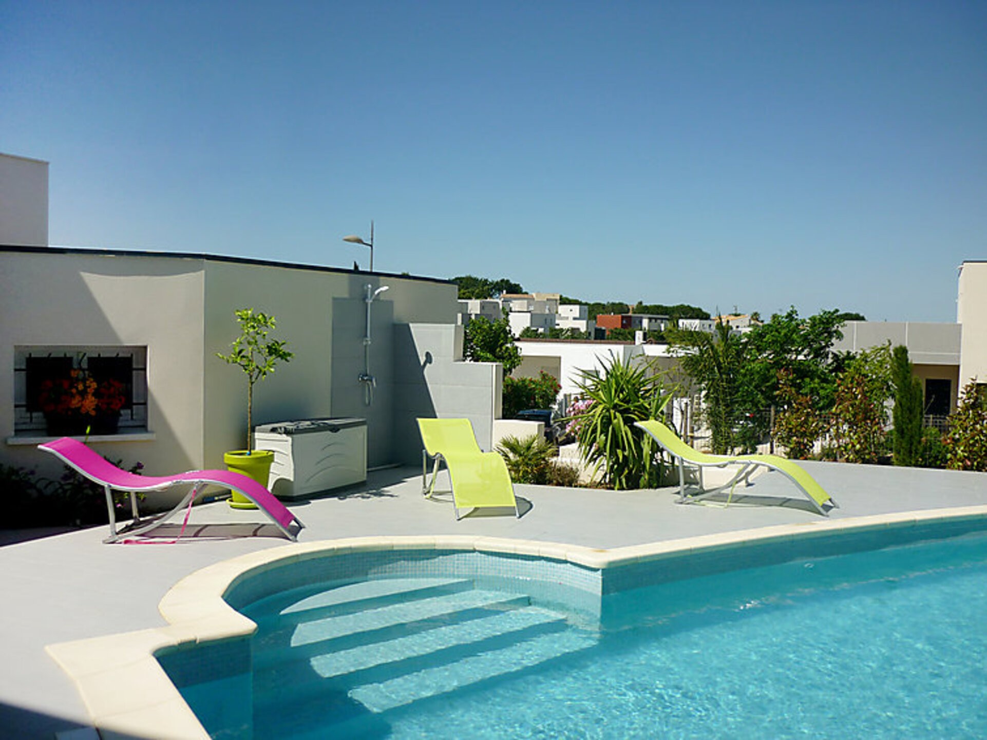 3 km from Cap d’Agde: Very beautiful villa “Villa du Capiscol”, built in 2013. In the district of Capiscol (nouveau quartier), 1 km from the centre, in the residential district, 3 km from the sea, 3 km from the beach. Private: property 616 m2 (fenced), well-kept garden, swimming pool angular (4 x 9 m, 40 m2, depth 115 - 140 cm, 01.06.-30.09.) with internal staircase and alarm system. Outdoor shower, parking (for 2 cars) on the premises. Shop 850 m, shopping centre 2.2 km, restaurant 1.3 km, bar 3.6 km, bakery 800 m, sandy beach “Môle” 3 km. Sports harbour 3.8 km, golf course (27 hole) 4.5 km, tennis 3.7 km, riding stable 3.3 km. Nearby attractions: Accrobranche 2.2 km, Casino 2.6 km, Musée de l’Ephèbe 3.3 km, Grande Roue 3.5 km, Aqualand 4 km, Ile des loisirs 4.2 km. The terrace of the 1st floor is not accessible to tenants for security reasons.