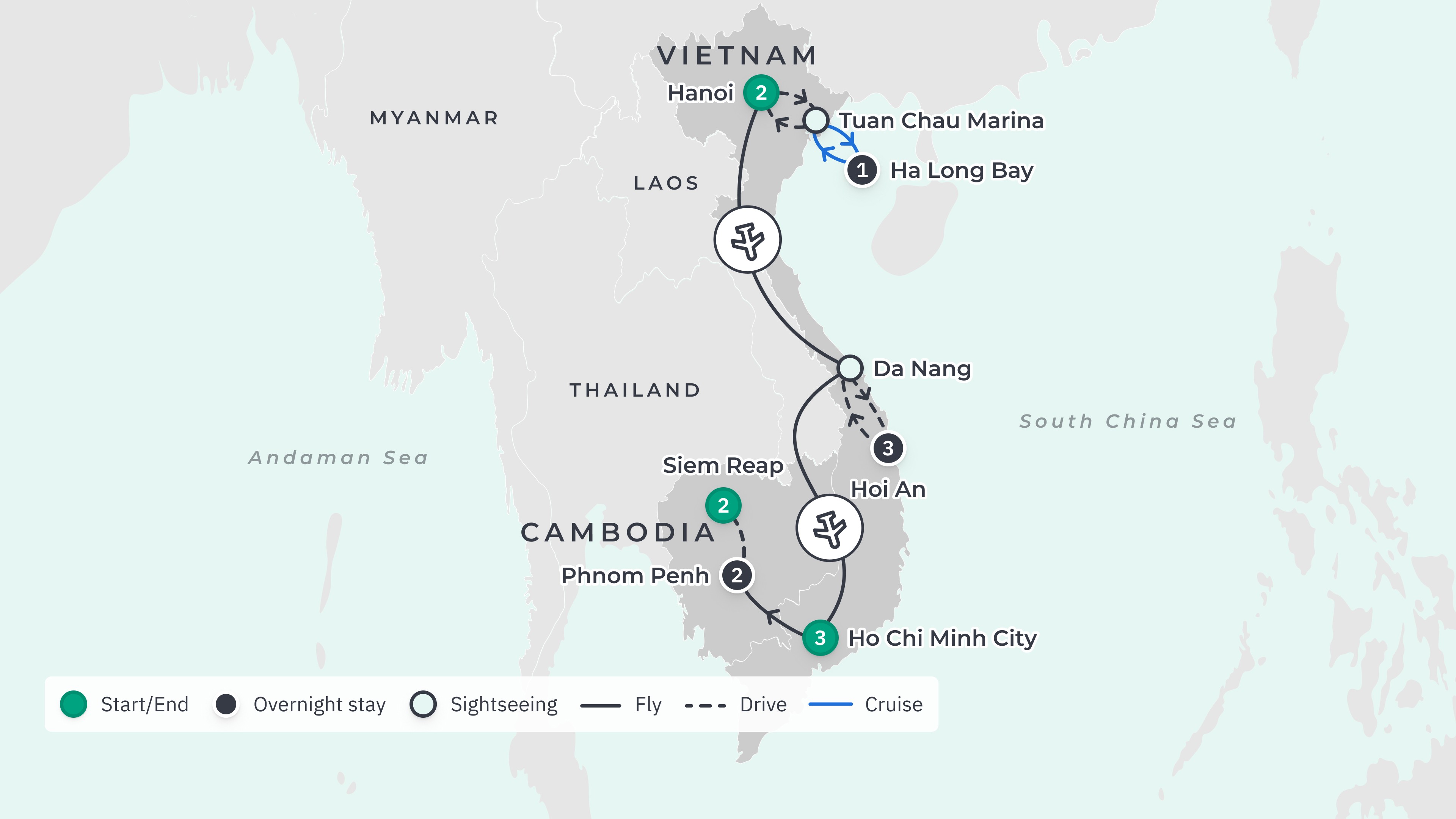 Your tour begins at Noi Bai International Airport (HAN) and ends at Siem Reap–Angkor International Airport (SAI), with return airport transfers.