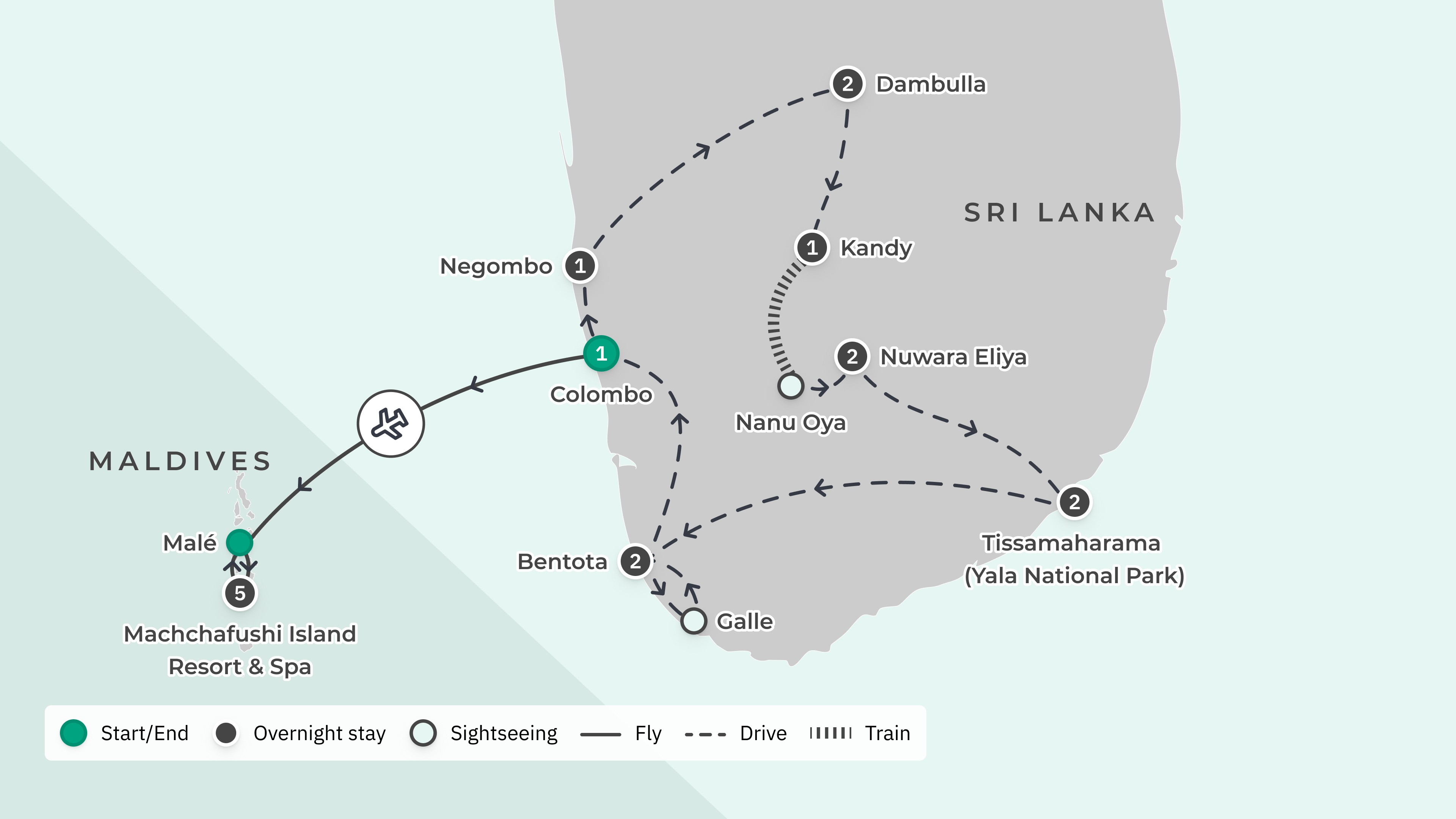 Your tour begins at Bandaranaike International Airport (CMB) and ends at Velana International Airport (MLE), with return airport transfers.