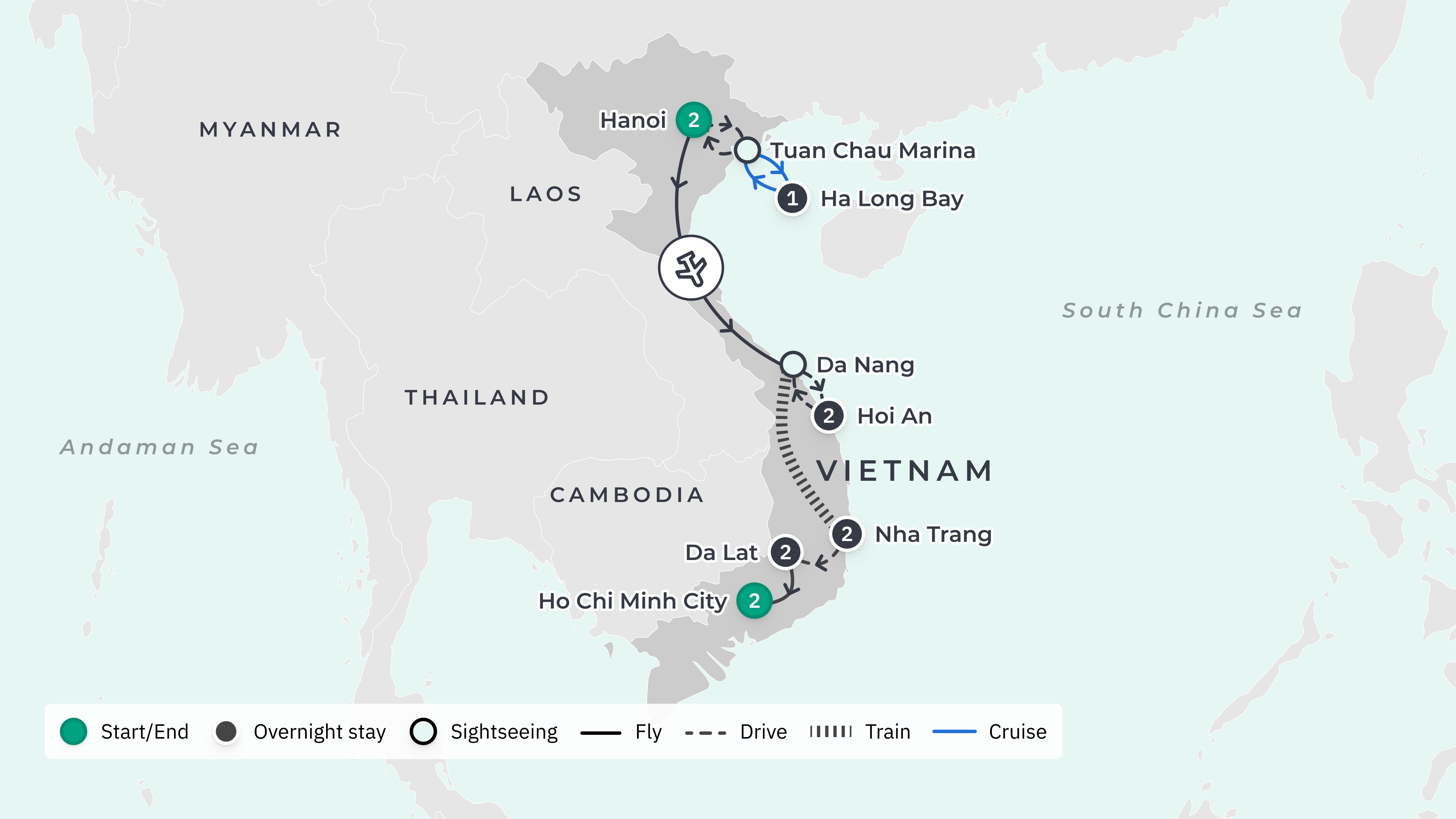 Your tour begins at Noi Bai International Airport (HAN) and ends at Tan Son Nhat International Airport (SGN), with return airport transfers.
