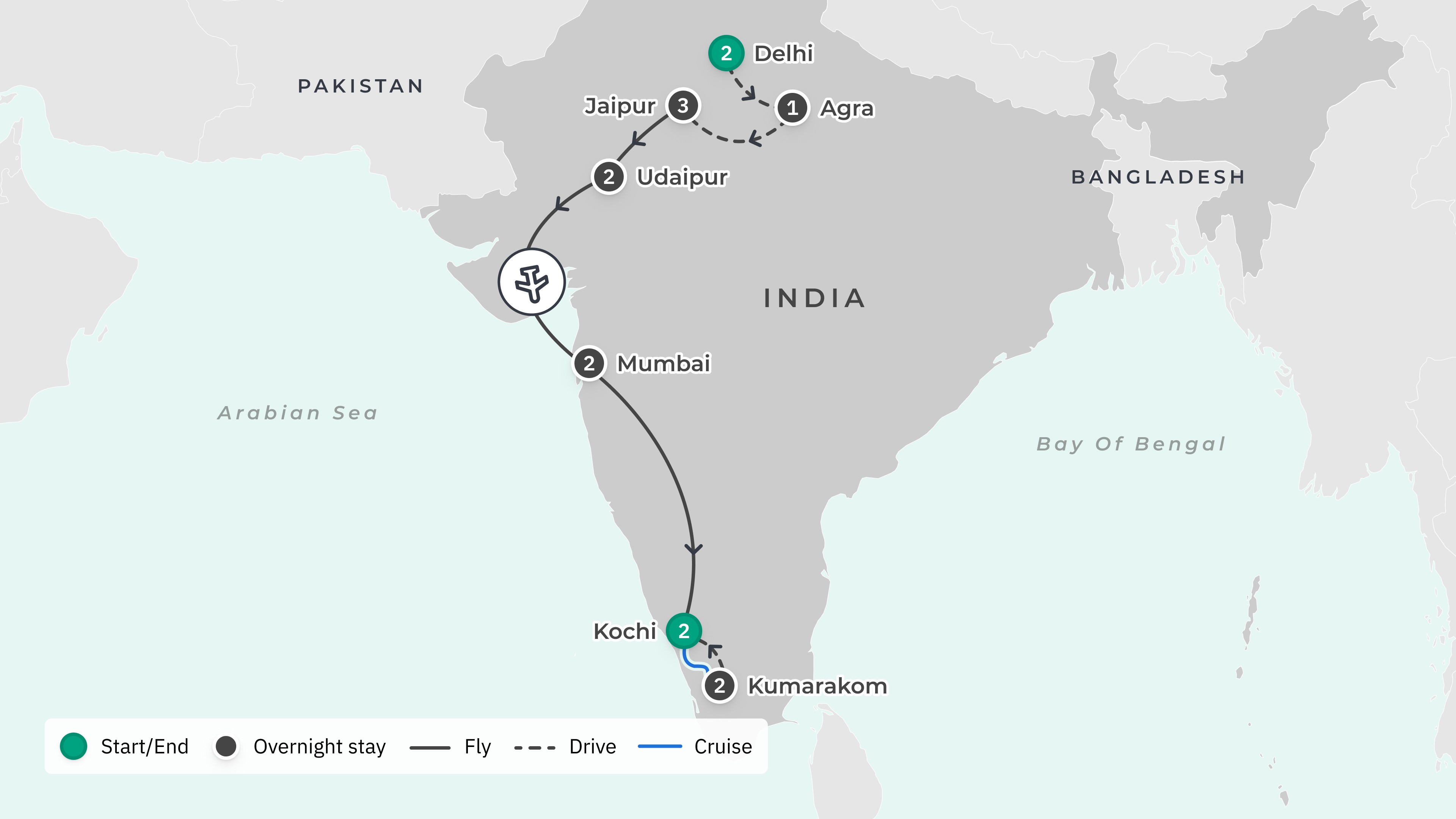 Your tour begins at Indira Gandhi International Airport (DEL) and ends at Cochin International Airport (COK), with return airport transfers.