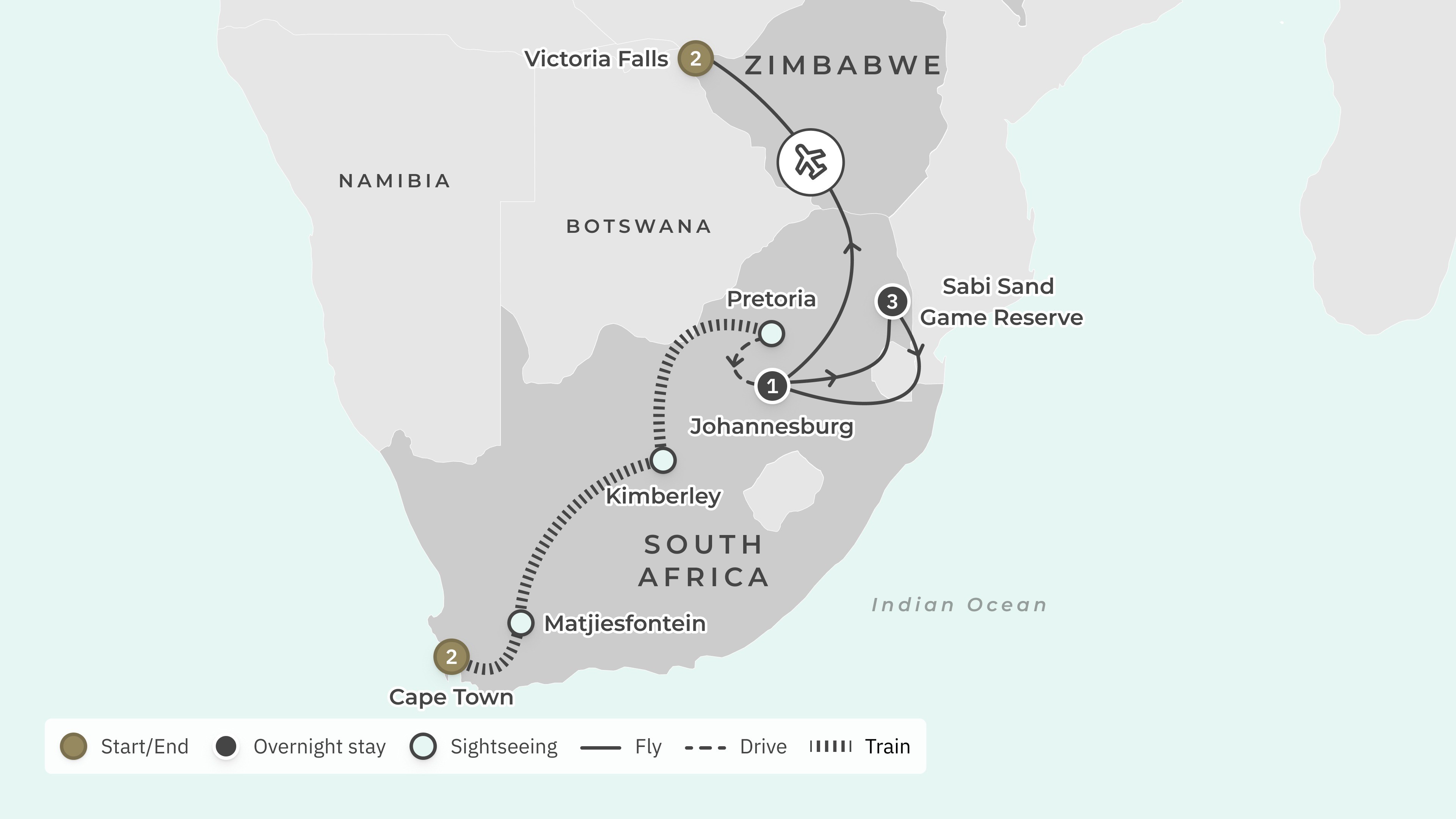 Your tour begins at Cape Town International Airport (CPT) and ends at Victoria Falls Airport (VFA) with return airport transfers.