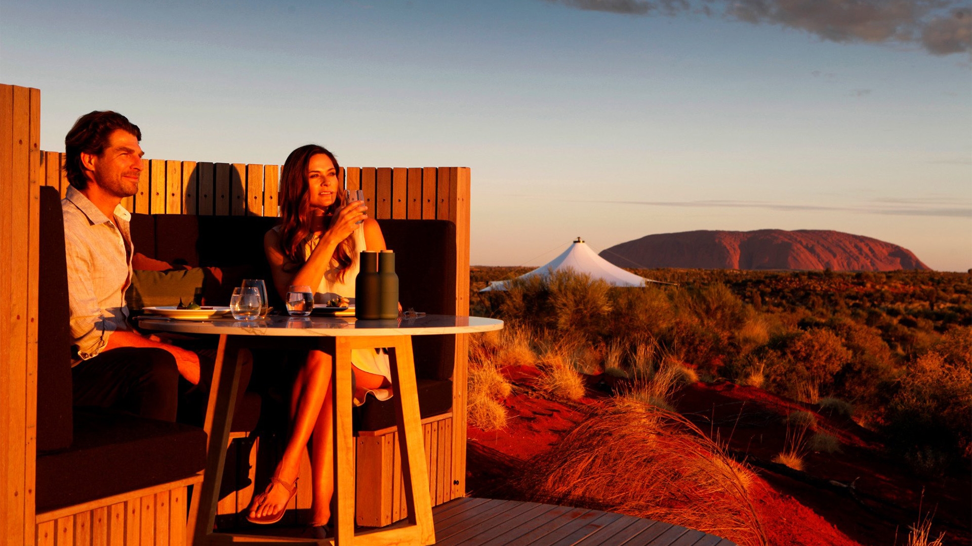 Later, board your private plane once more for another flight further north. Keep a lookout for the world-famous sacred site you’ve been waiting for, as Uluṟu-Kata Tjuṯa National Park comes into view. Landing at Ayers Rock Airport (AYQ), you’ll be transferred to your lodgings at Longitude 131° where you’ll unpack with Uluṟu on the horizon.