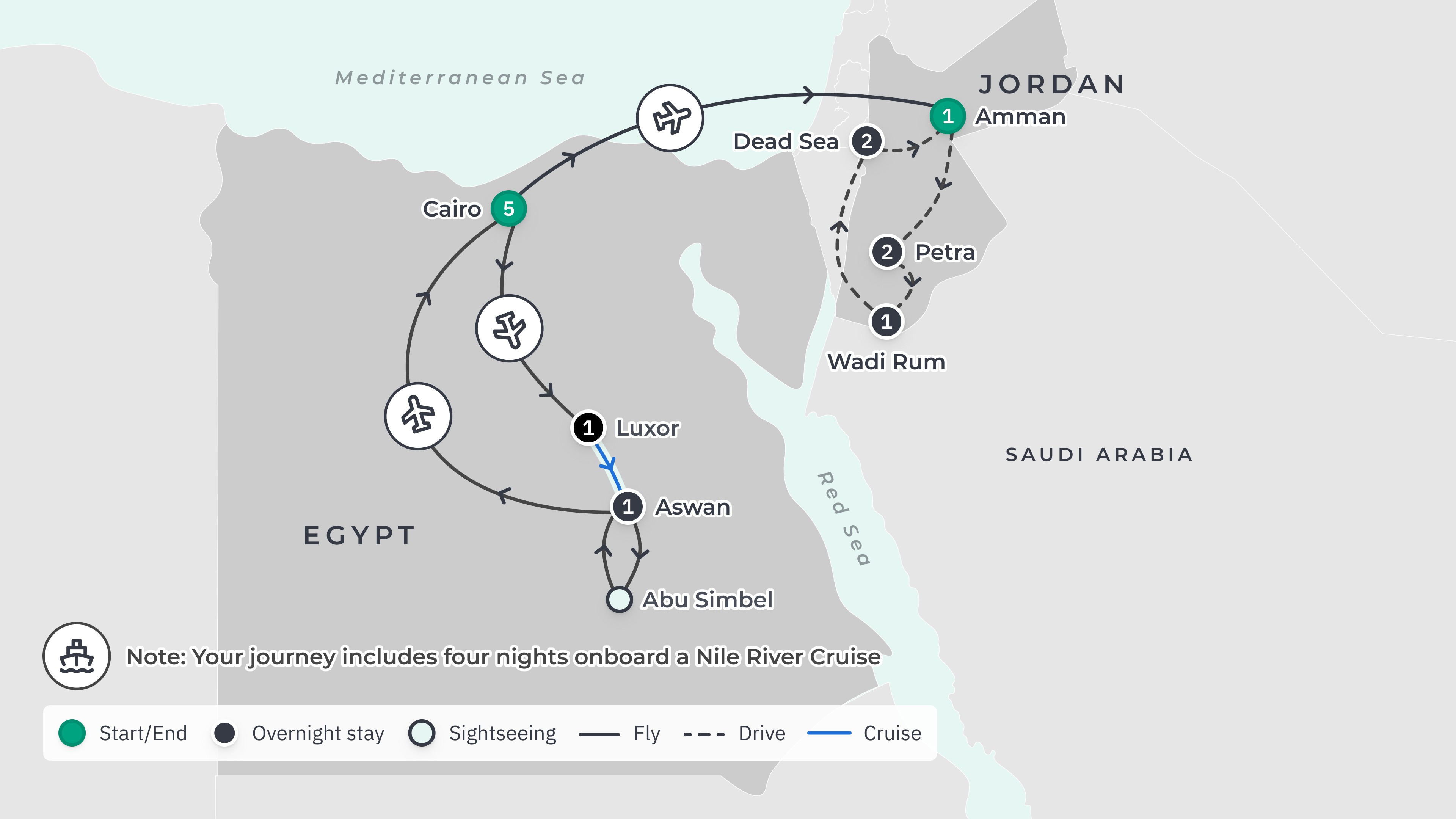 Your tour begins at Cairo International Airport (CAI) and ends at Queen Alia International Airport (AMM) with return airport transfers.