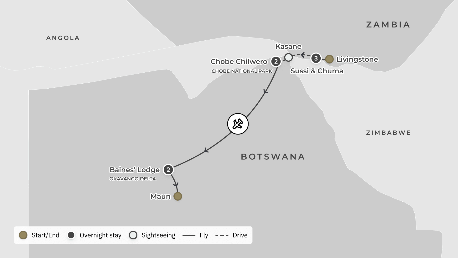 Your tour begins at Harry Mwaanga Nkumbula International Airport (LVI) and ends at Maun International Airport (MUB), with return airport transfers.