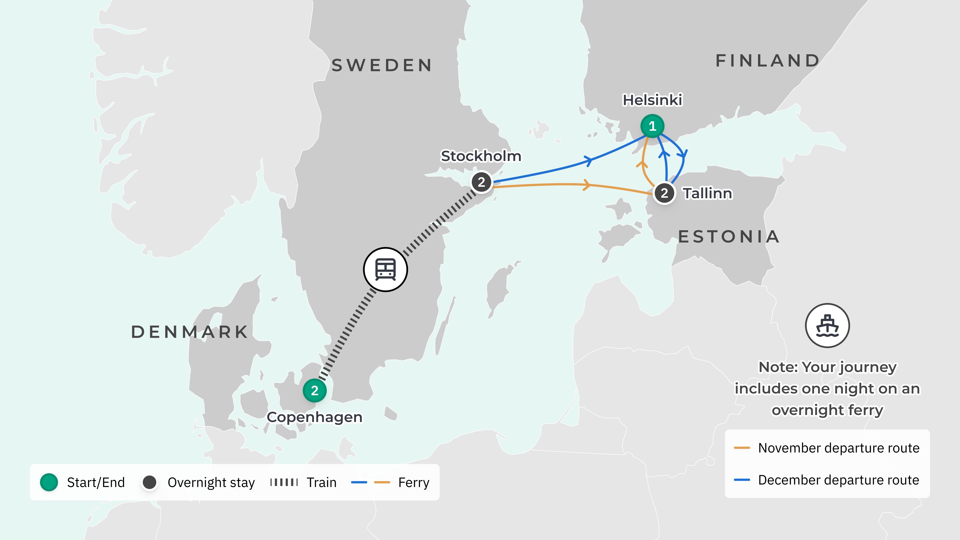 • For tours departing 5 December, the ferry from Stockholm will travel to Helsinki before guests transfer to a second vessel for arrival in Tallinn.