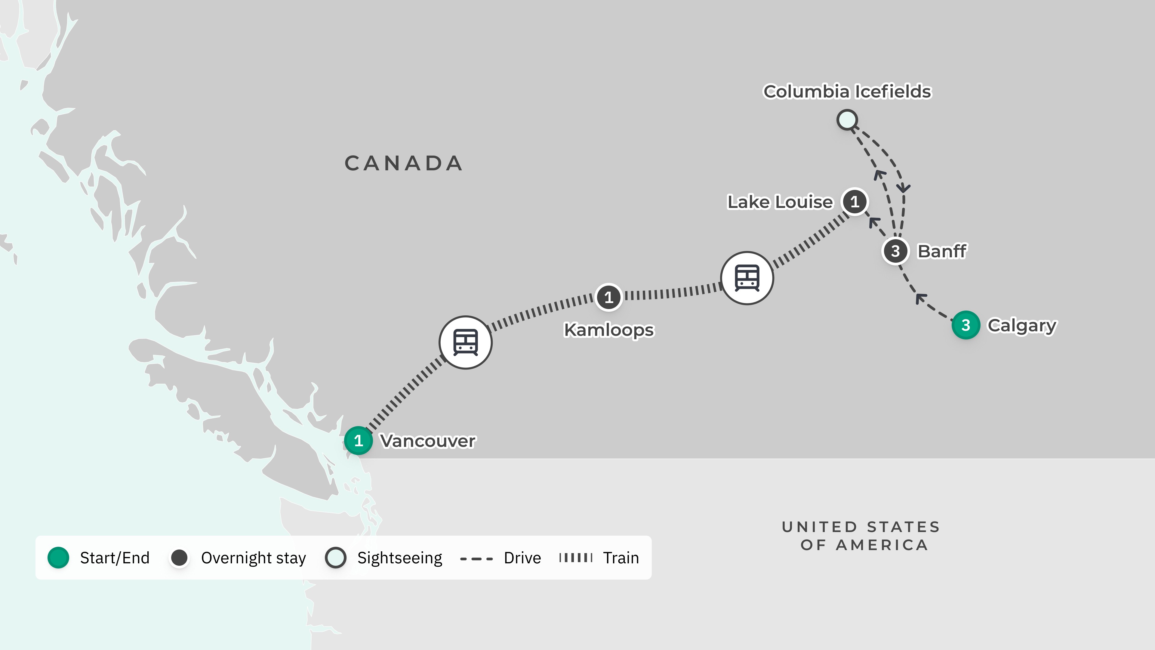 Your tour begins at Calgary International Airport (YYC) and ends at Vancouver International Airport (YVR).