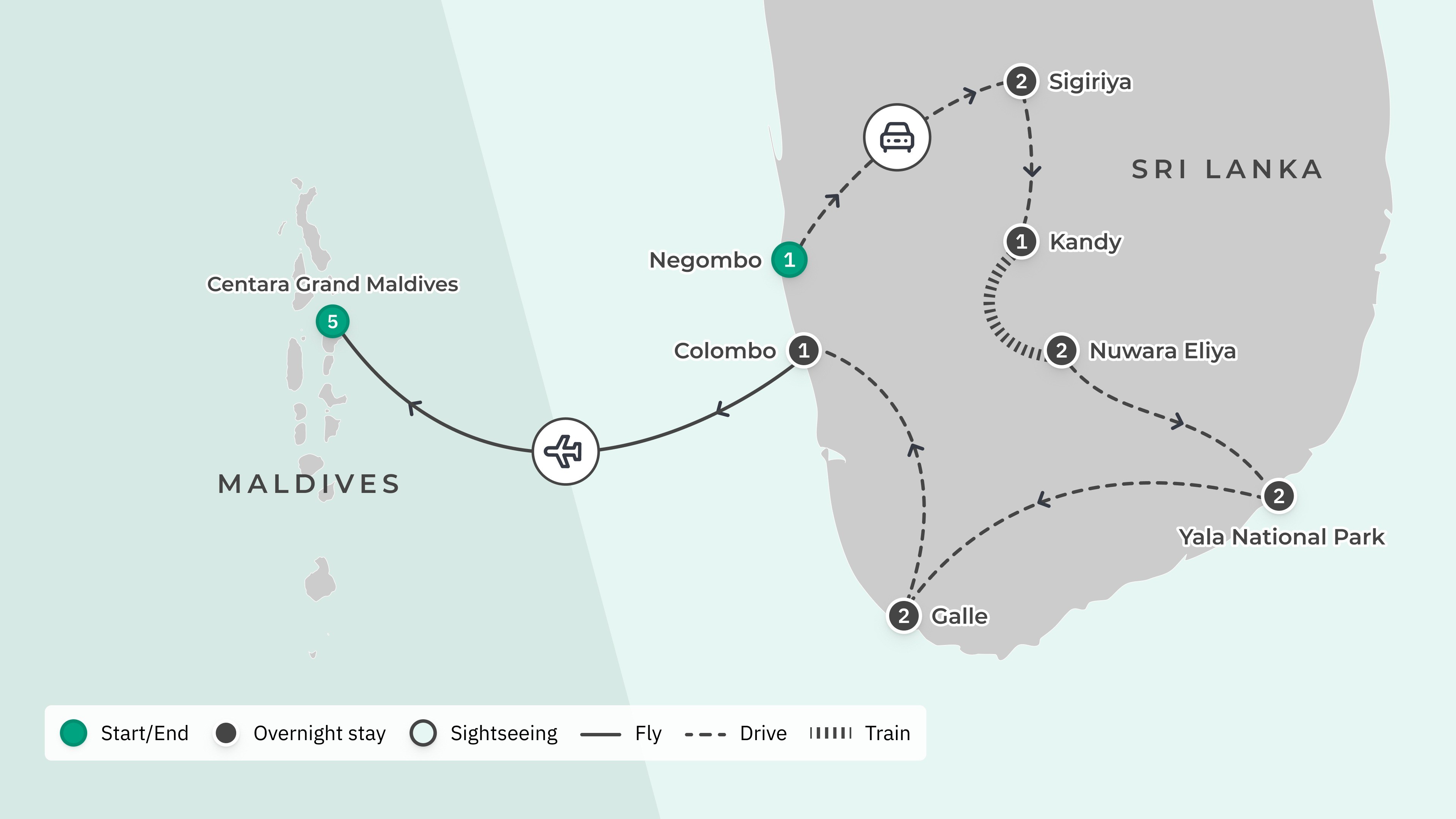 Your tour begins at Bandaranaike International Airport (CMB) with shared arrival transfers, depending on arrival time, and ends at Velana International Airport (MLE), with return luxury speedboat transfers.